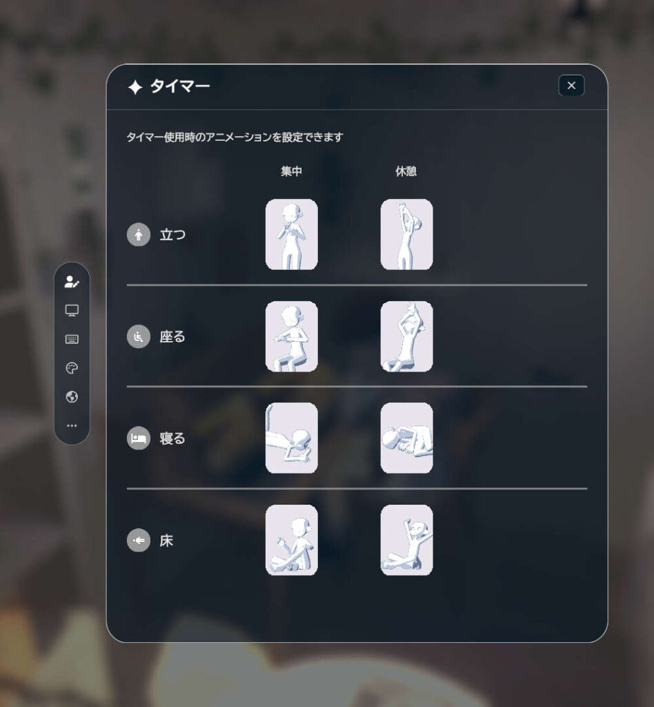 タイマーに合わせて、キャラの作業中と休憩中の動きを設定することができます。